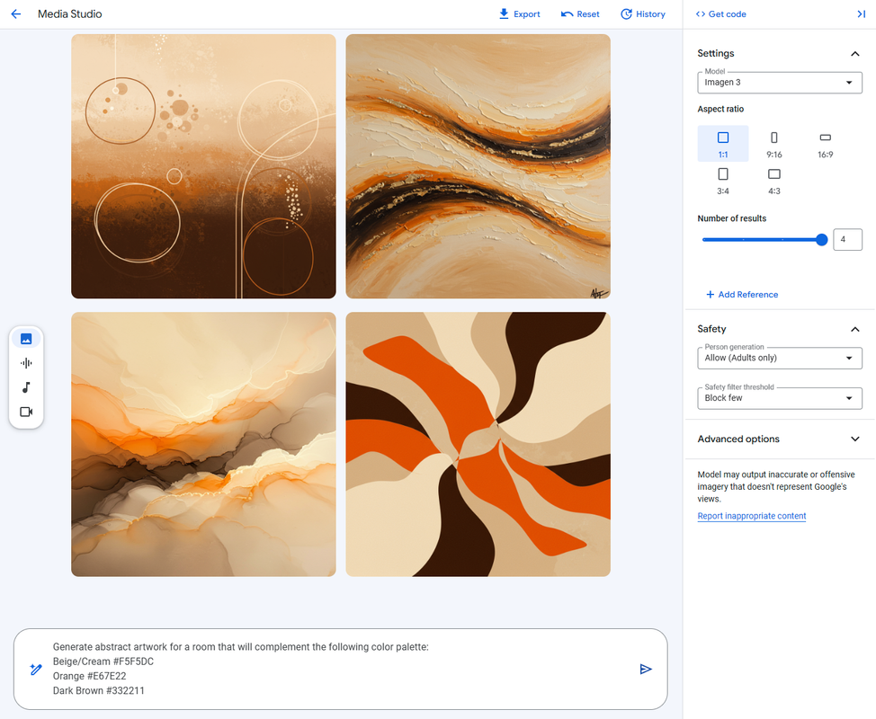 In this example, we’re extracting colors and themes based on the user’s environment and generating artwork that matches it. This is done by passing an image of what the user sees and a prompt that tells Gemini to extract primary colors from the room so they can be used in the artwork.