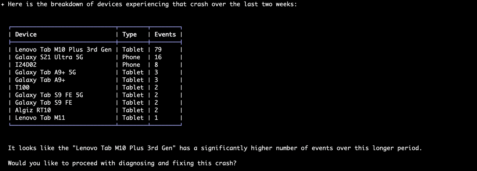Gemini CLI can use filters on the Crashlytics API to find crashes specifically related to tablets. By default, it returns the top 5 issues, but you can change that criteria to meet your needs like asking for it to return more issues or exclude non-fatal issues.