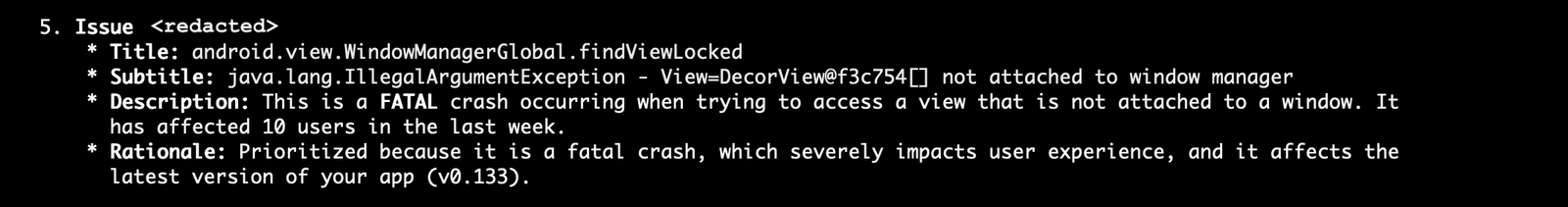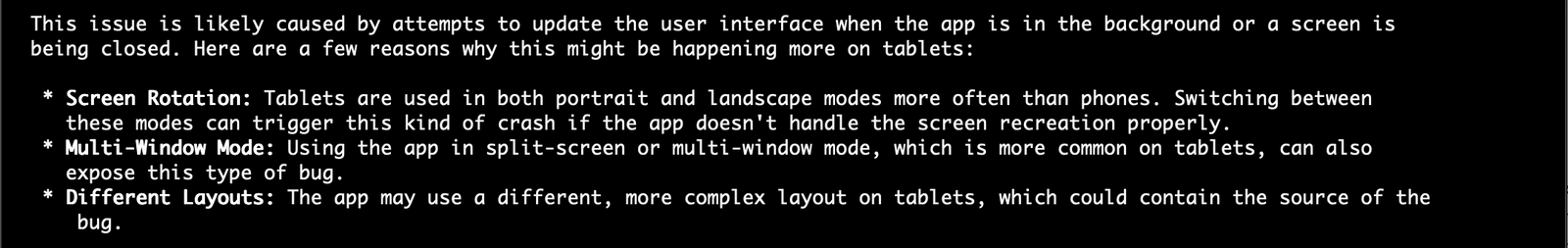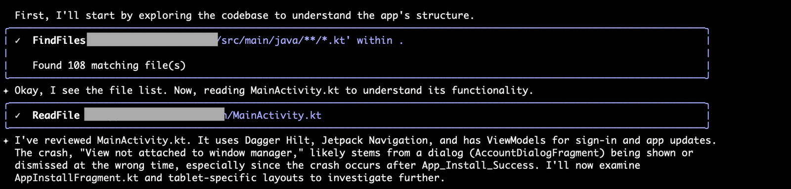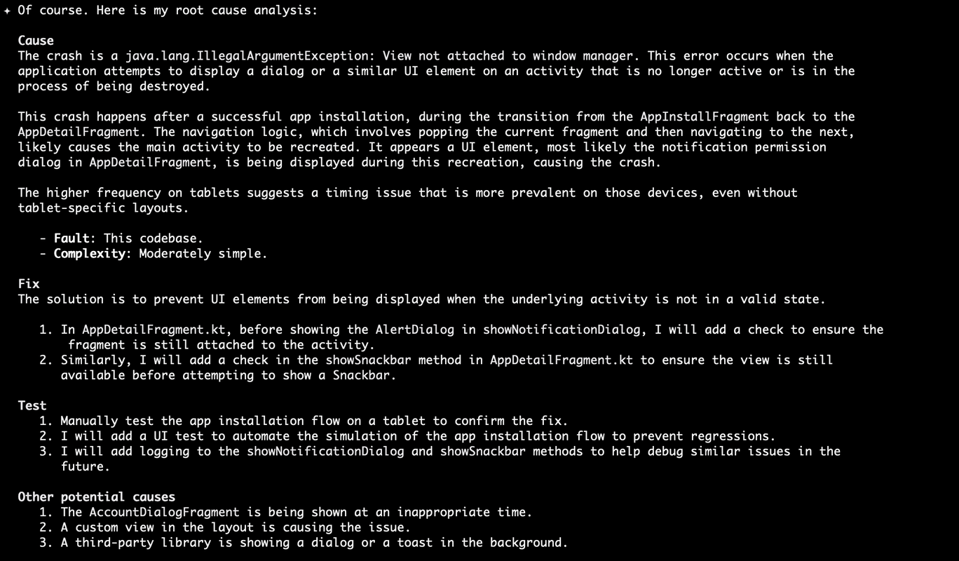 With issues like this, it can be difficult to pin-point which activity is the likely cause. This is something where traditionally, it could take hours to scour the code and the stack traces to figure out which class is the culprit. But Gemini CLI was able to analyze the codebase in minutes, saving you time and headache in switching between the Firebase console and your codebase.