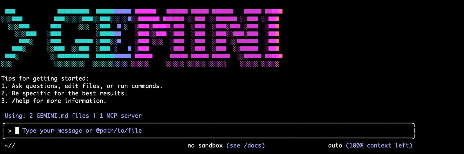 You should see the Gemini CLI start up with some ASCII art and a message that shows you which GEMINI.md files and how many MCP servers are connected.