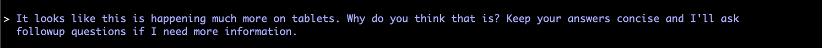 As part of the investigation, you can ask clarifying questions or ask for more information. For example, you might want to know whether this crash is happening primarily on tablets or on all devices, so you could ask something like “What devices is that crash happening on?”