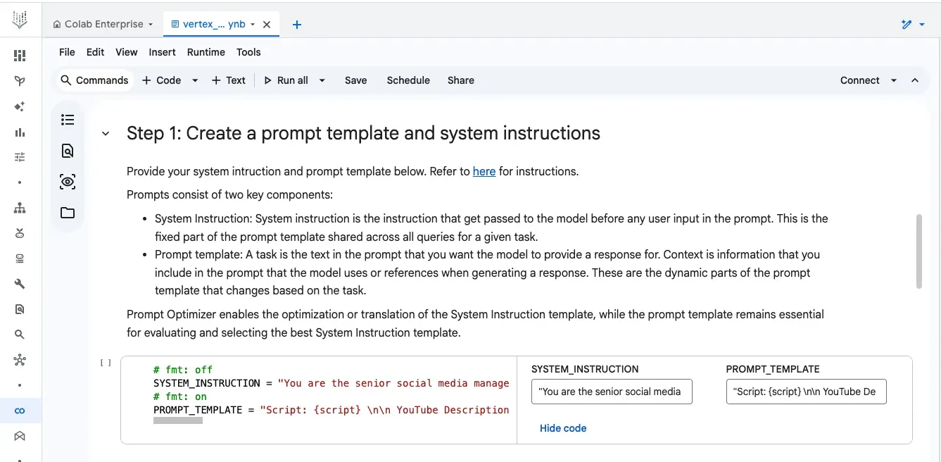 Once we have our CSV uploaded, I am able to start using the data driven prompt optimizer. This allows me to walk through a Colab enterprise notebook setting different parameters for optimization of a prompt to improve the results from my original attempt at a system prompt. You can see my original system prompt: